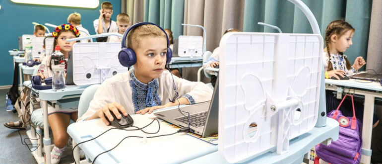 Дети в классе занимаются за компьютером в новом цифровом учебном центре, созданном ЮНИСЕФ и партнерами. Украинские дети начинают четвертый учебный год в условиях вторжения, поскольку 4,6 миллиона сталкиваются…