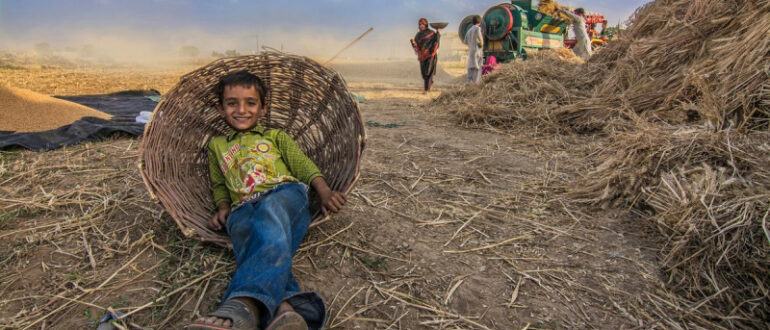 Маленький мальчик отдыхает в плетеной корзине, пока его семья обмолачивает собранную пшеницу. Социальный саммит в Дохе: Бизнес и гражданское общество борются бок о бок за более справедливое будущее…