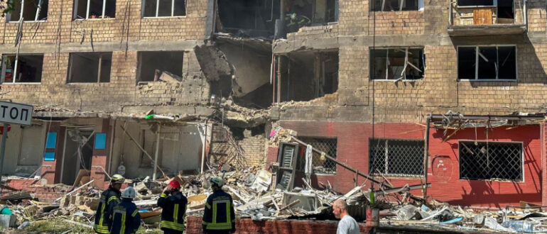 Спасатели стоят возле разрушенного здания в Киеве, столице Украины. Кратко о мировых новостях: Нарушения прав человека в России на Украине, США не явились на заседание по правам человека,…